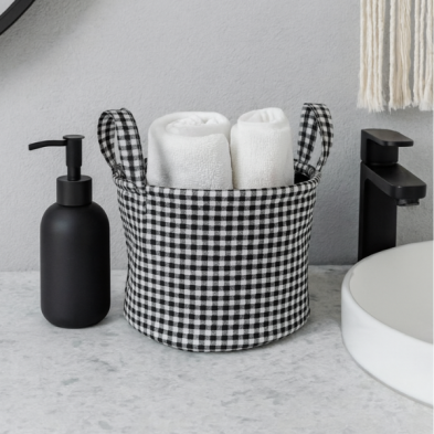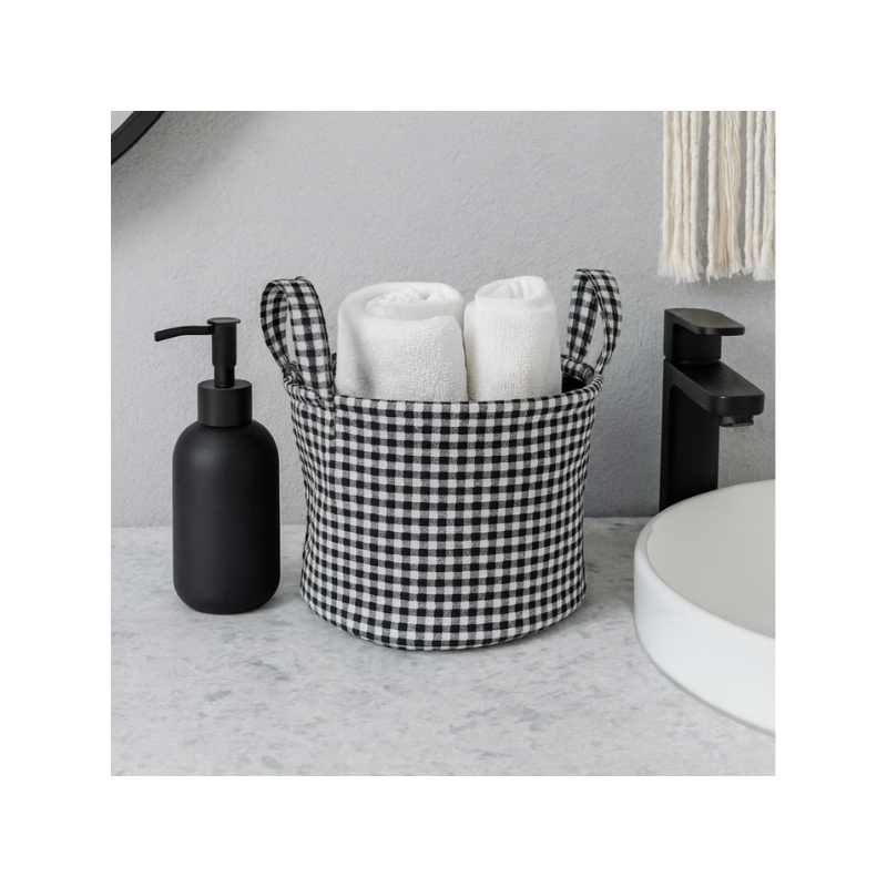 Organizador de tela plegable con diseño moderno y práctico, ideal para mantener cualquier espacio ordenado. Está confeccionado con un patrón de cuadros en blanco y negro que aporta un estilo actual y versátil, perfecto para baños, dormitorios, mesadas o estantes.