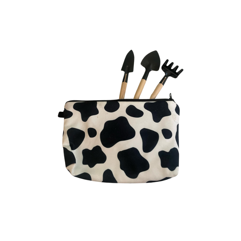 Kit práctico y compacto para el cuidado de cactus y suculentas. Incluye 3 mini herramientas de jardinería con mango de madera y un estuche impermeable con diseño blanco y negro.