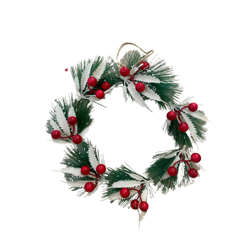Confeccionada con cuidado y atención al detalle, esta corona captura la esencia misma de la Navidad. Las ramas verdes exuberantes proporcionan una base acogedora, mientras que los toques vibrantes de rojo aportan ese toque festivo y alegre. El blanco suave añade un toque de elegancia y pureza, creando un equilibrio armonioso que evoca la magia de la temporada.