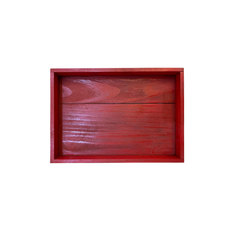Bandeja decorativa de madera pintada en color rojo, ideal para sumar un toque cálido a la decoración del hogar. Su diseño simple y robusto la convierte en una pieza versátil, perfecta tanto para uso decorativo como funcional.