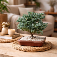 Su follaje compacto en tonos verde azulado y su forma armónica lo convierten en un clásico del mundo del bonsái, muy valorado por su resistencia y fácil mantenimiento.