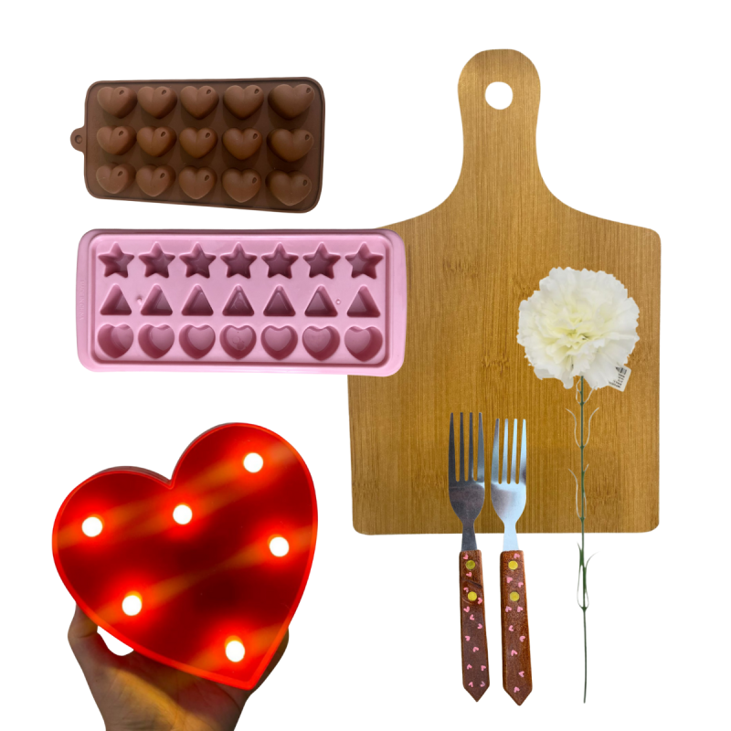 Set ideal para crear una velada romántica y especial en la noche de San Valentín. Perfecto para compartir una picada dulce o salada, preparar chocolates caseros y ambientar el momento con una luz cálida y detalles decorativos.