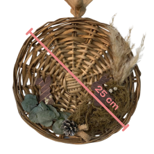 La base está realizada en mimbre tejido, decorada con detalles inspirados en la naturaleza: figuras de conejos, musgo decorativo, hojas de eucalipto y pequeños elementos naturales que crean una composición delicada y armoniosa. Es una pieza liviana y fácil de colgar.