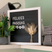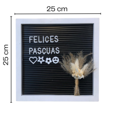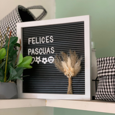 Cartel decorativo de Pascuas ideal para ambientar el hogar con un estilo simple y natural. Incluye la frase “Felices Pascuas” sobre tablero con marco blanco y un delicado ramito de hojas secas naturales que aporta un toque cálido y artesanal.